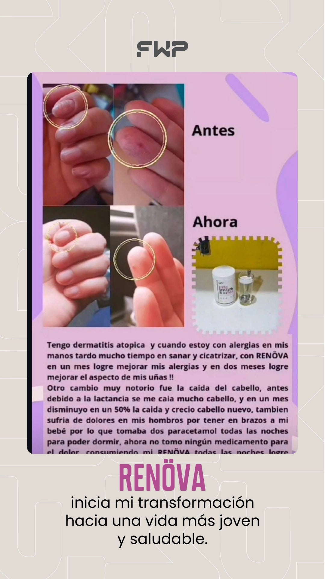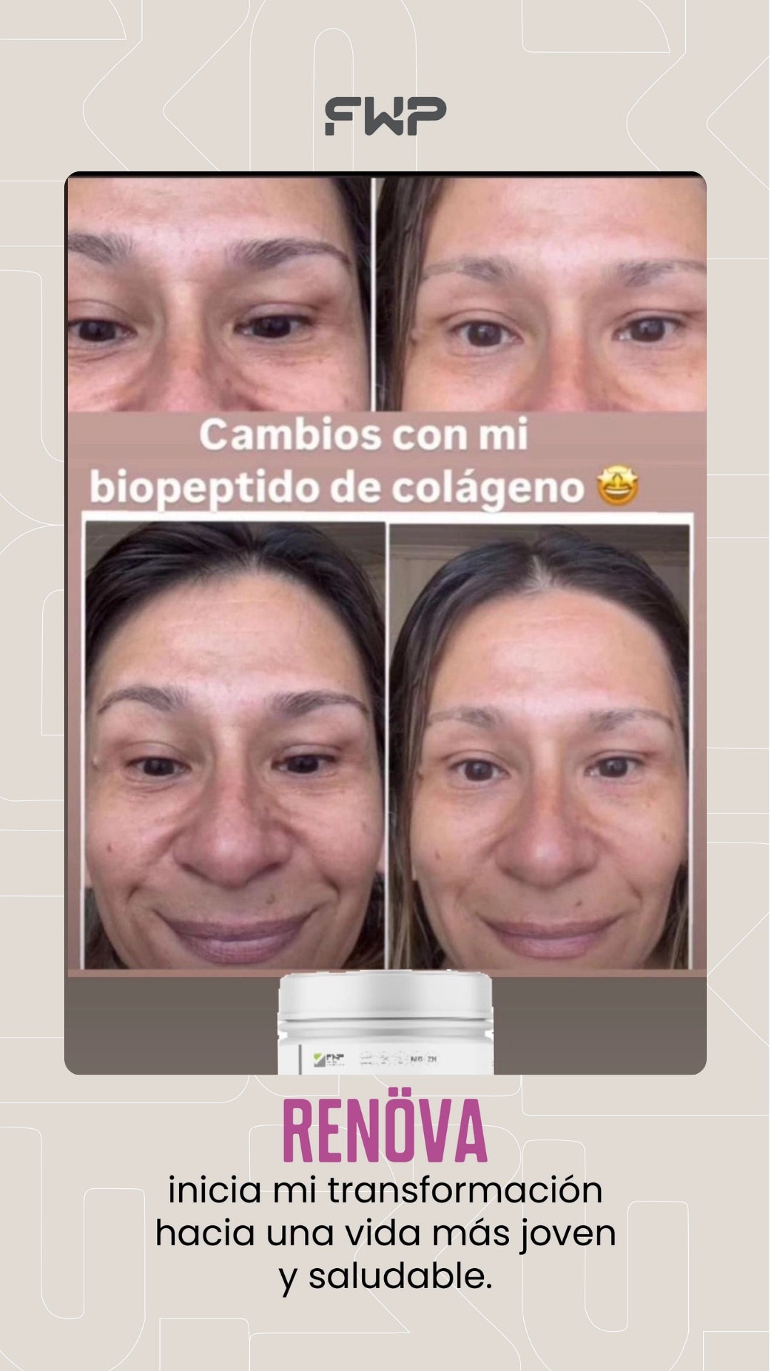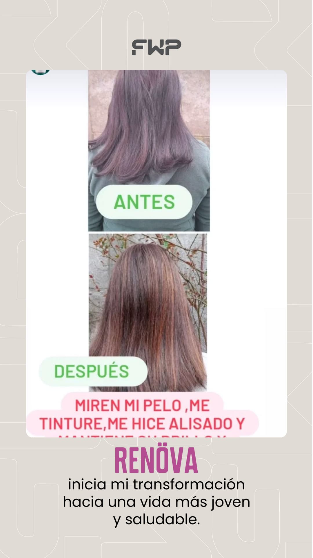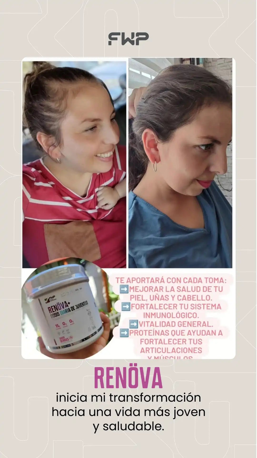 Si tu piel luce apagada, tus uñas frágiles y tu cabello sin vida, es porque tu cuerpo ha perdido colágeno.RENÖVA+ combina colágeno hidrolizado, Resveratrol, Coenzima Q10, Zinc y Magnesio, una fórmula que nutre desde adentro, combate el envejecimiento y fortalece tejidos. Recupera elasticidad, brillo y firmeza, porque la verdadera belleza empieza en tu interior.