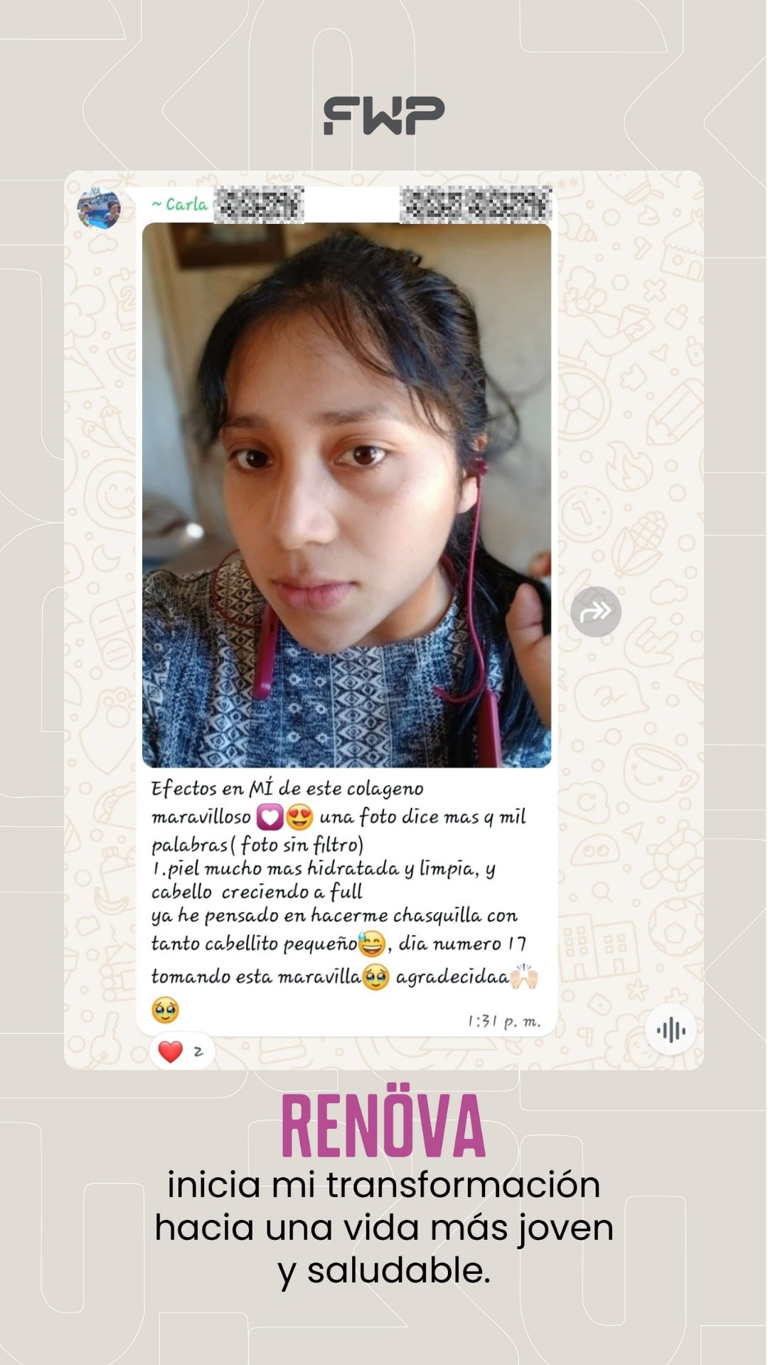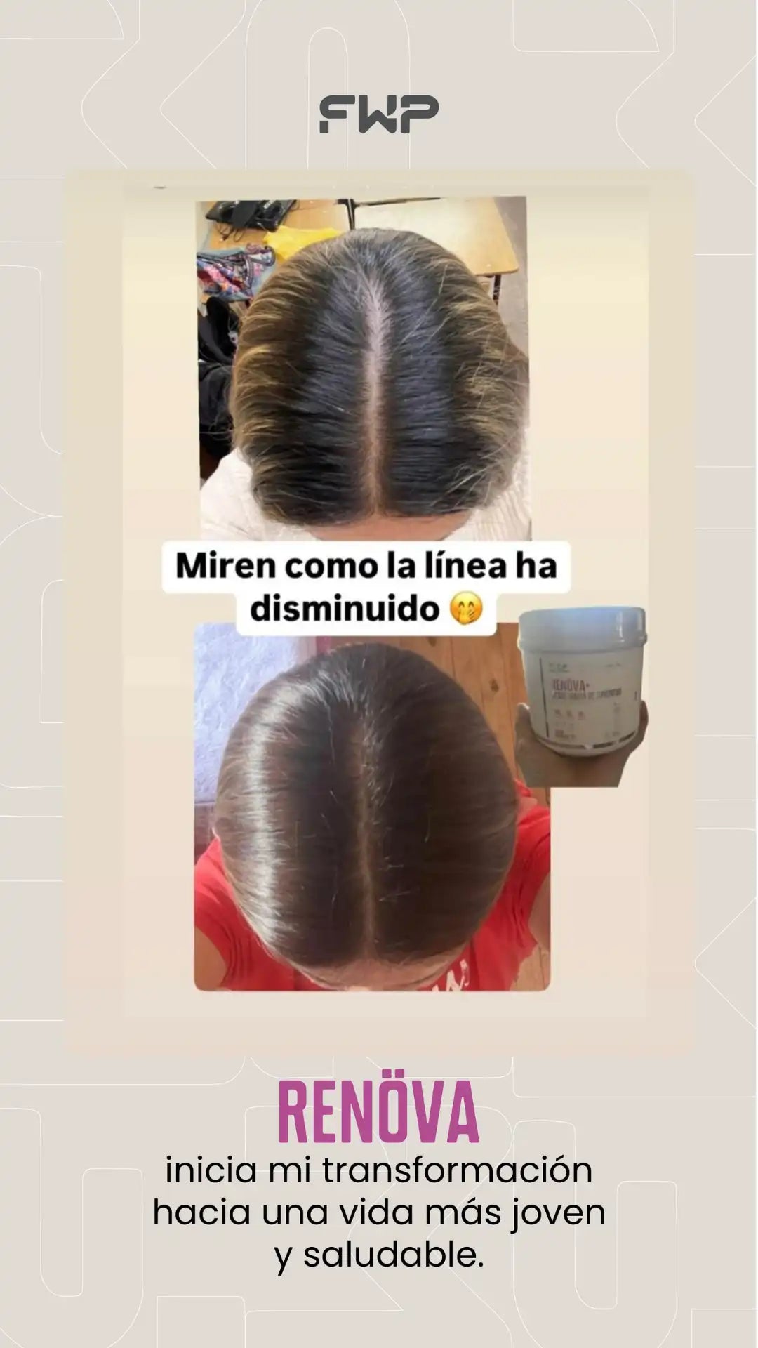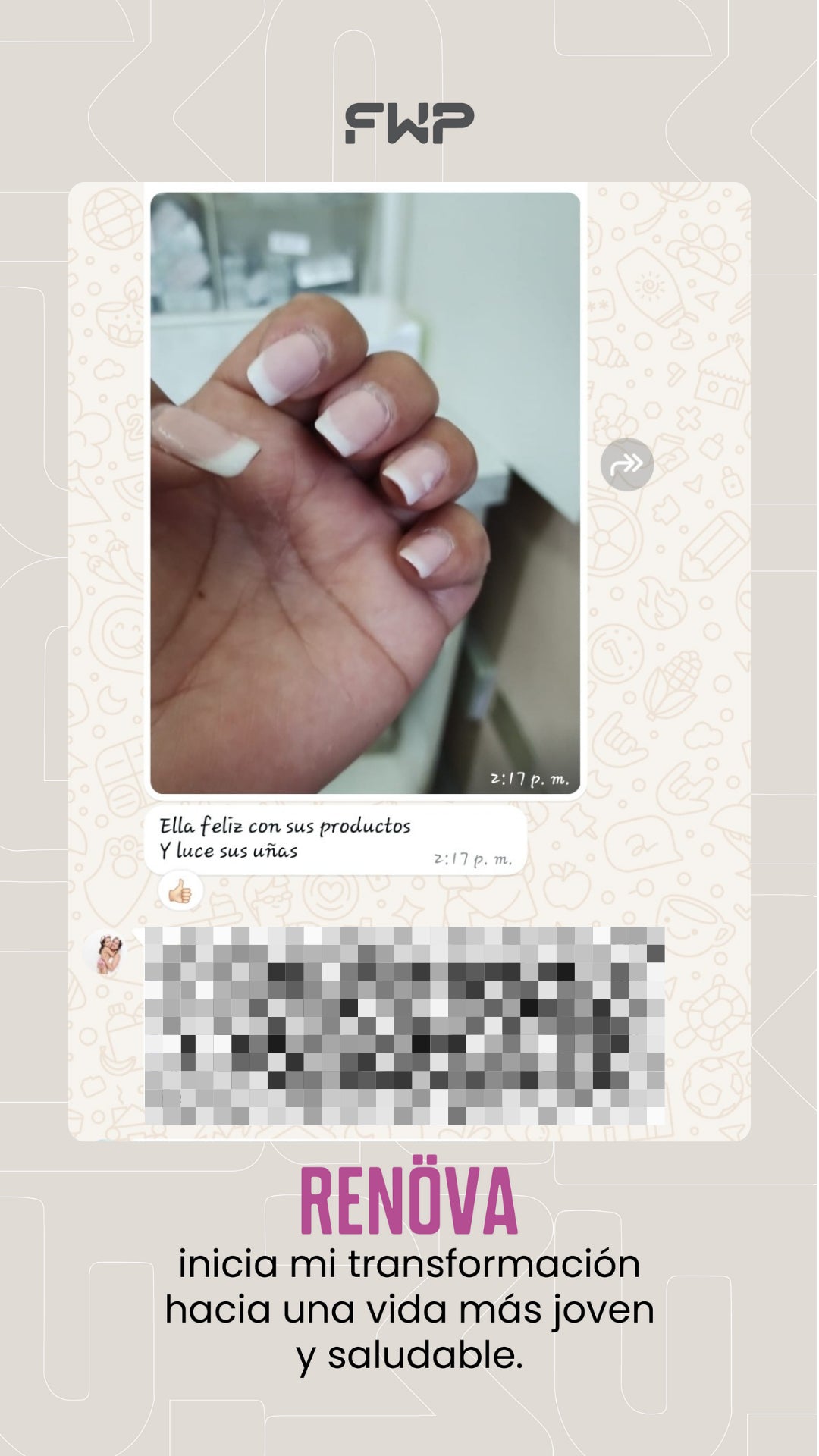 Las arrugas no aparecen de la nada, son el reflejo del desgaste celular y la falta de colágeno. Con cada toma de RENÖVA+, tu piel recibe colágeno hidrolizado y Resveratrol, ingredientes que rellenan líneas de expresión, regeneran células y dan elasticidad. En 21 días, tu rostro estará más firme, suave y joven, porque la belleza no tiene edad, ¡y tú lo mereces!